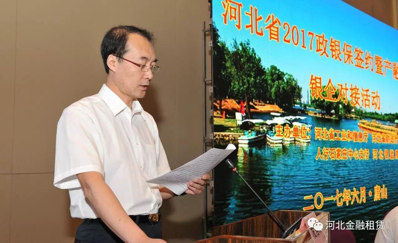 日前,河北省2017政銀保合作簽約暨產融合作銀企對接活動在國家產融合作試點城市唐山市舉行。本次活動由河北省工業和信息化廳、省財政廳、人行石家莊中心支行、河北銀監局聯合主辦,河北省金融租賃有限公司(以下簡稱河北金租)受邀參加本次活動。
