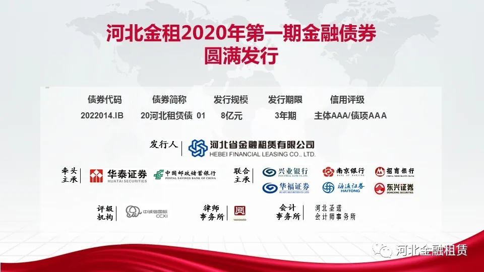 日前,河北省金融租賃有限公司(以下簡稱“河北金租”)2020年第一期金融債券成功發行,發行規模8億元,期限3年。此次河北金租發行的金融債券場內認購倍數達到2倍,投資人認可度較高,債券所募資金將主要用于清潔能源、節能環保、醫療健康等公司戰略行業項目投放,同時積極助力新冠肺炎防控,為防疫醫療設備商和服務商、新冠疫情定點醫療機構提供金融服務,支持湖北等地區公共事業及工程裝備制造等行業發展。