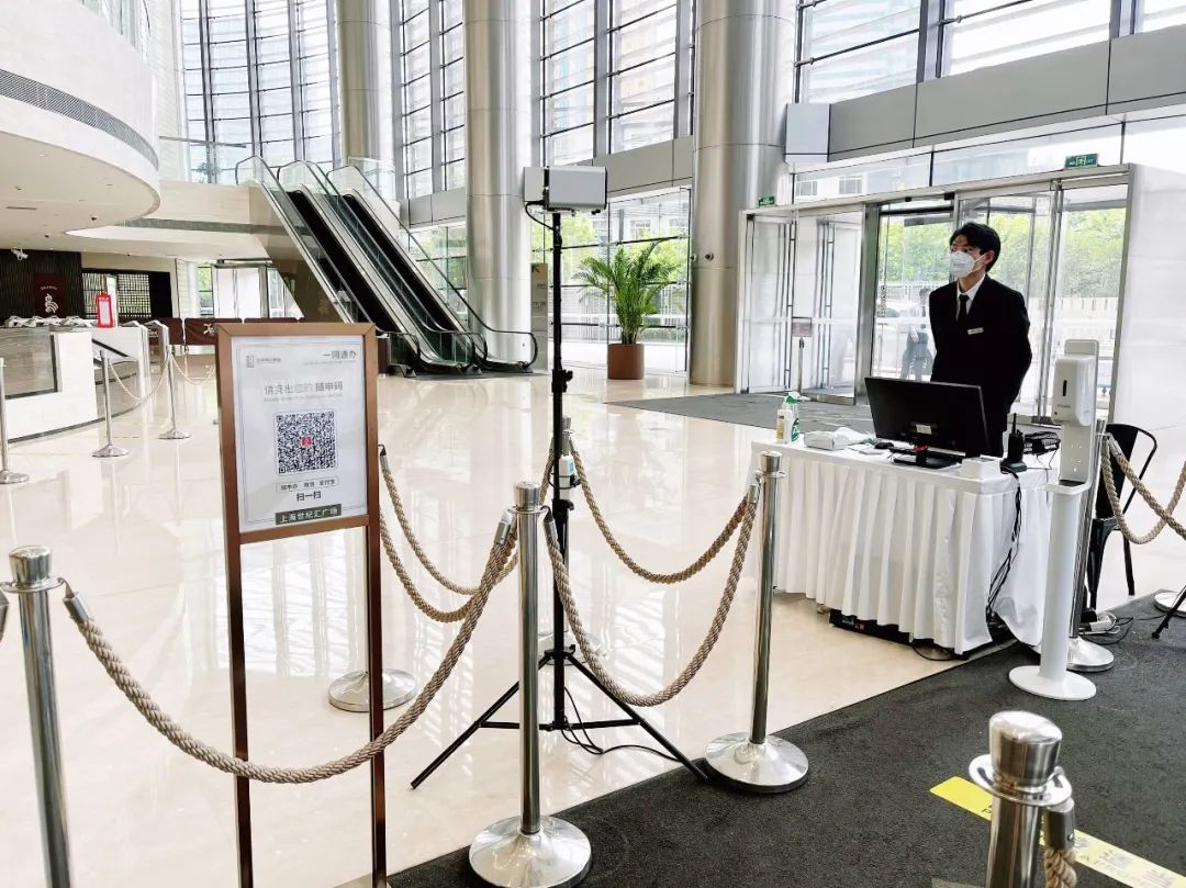 工區(qū)大樓布設(shè)健康核驗一體機“數(shù)字哨兵”,各人員有序掃碼核驗入場。
