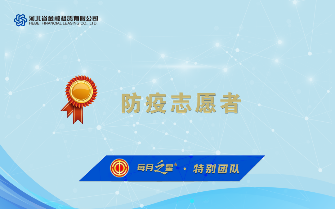 8河北金租一方面抓業(yè)務促投放,積極創(chuàng)新業(yè)務模式和打磨服務產(chǎn)品,一方面積極落實區(qū)域防疫政策,以責任傳遞租賃溫度,為疫情防控貢獻力量。工會委員會評選出本月“每月之星”,請優(yōu)勝團隊和優(yōu)秀員工珍惜榮譽,再立新功,請全體干部員工以先進為榜樣,再接再厲,再創(chuàng)佳績