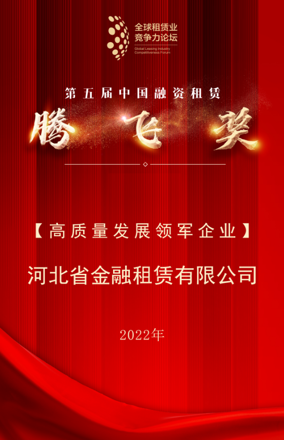 榮譽(yù) | 河北金租榮膺中國融資租賃“高質(zhì)量發(fā)展領(lǐng)軍企業(yè)”獎項